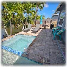 | Tranquil Daytime View of Pool Deck | Pool & Hot Tub in Standard Transitional / Fading Light Mode Activates at Dusk |